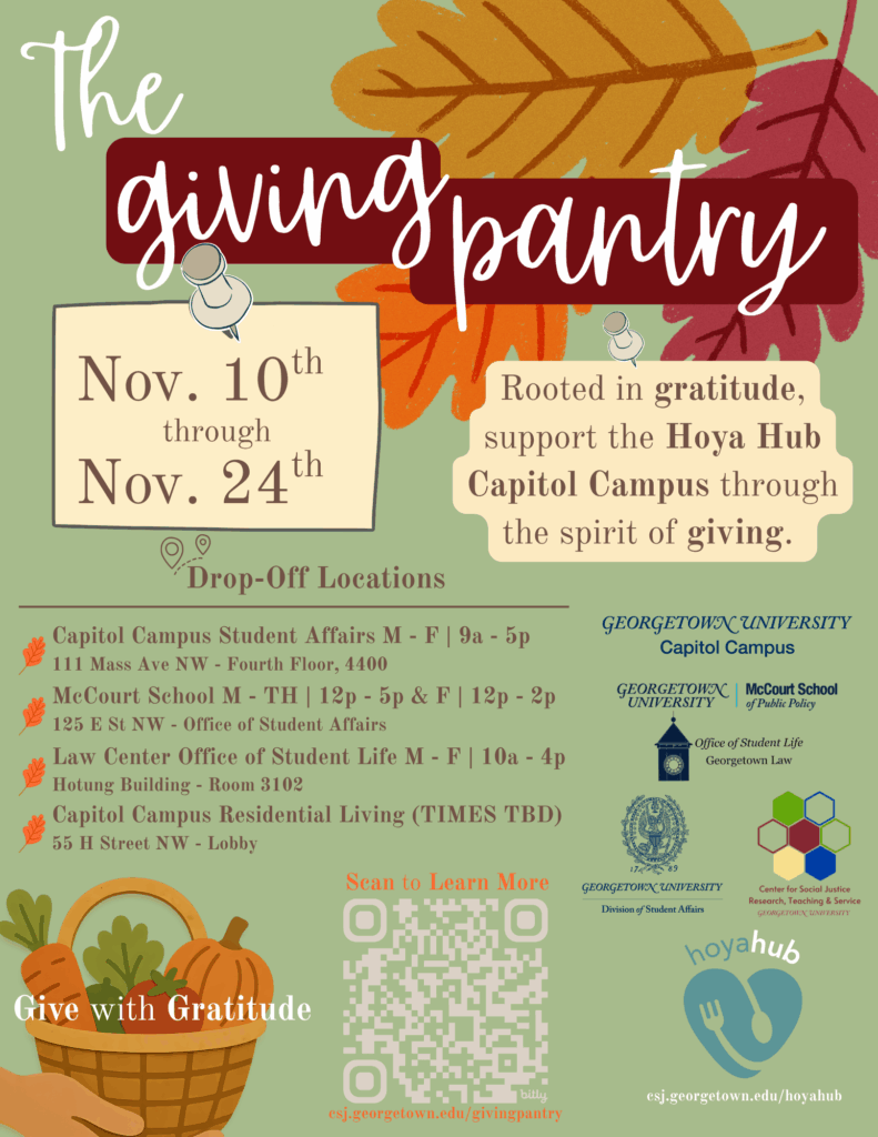 The Giving Pantry is a Thanksgiving-season initiative coordinated by the Center for Social Justice and sponsored by campus partners: Capitol Campus, McCourt School of Public Policy, Georgetown University Law Center’s Office of Student Life, and the Office of Residential Living @ 55 H – to support the Hoya Hub food pantry at Georgetown’s Capitol Campus. Rooted in gratitude and guided by dignity, The Giving Pantry invites students, faculty, and staff on the Capitol Campus to come together in the spirit of generosity — helping ensure every Hoya has access to the essential items they need throughout the holidays and beyond.